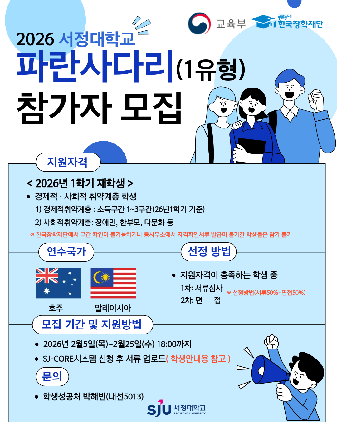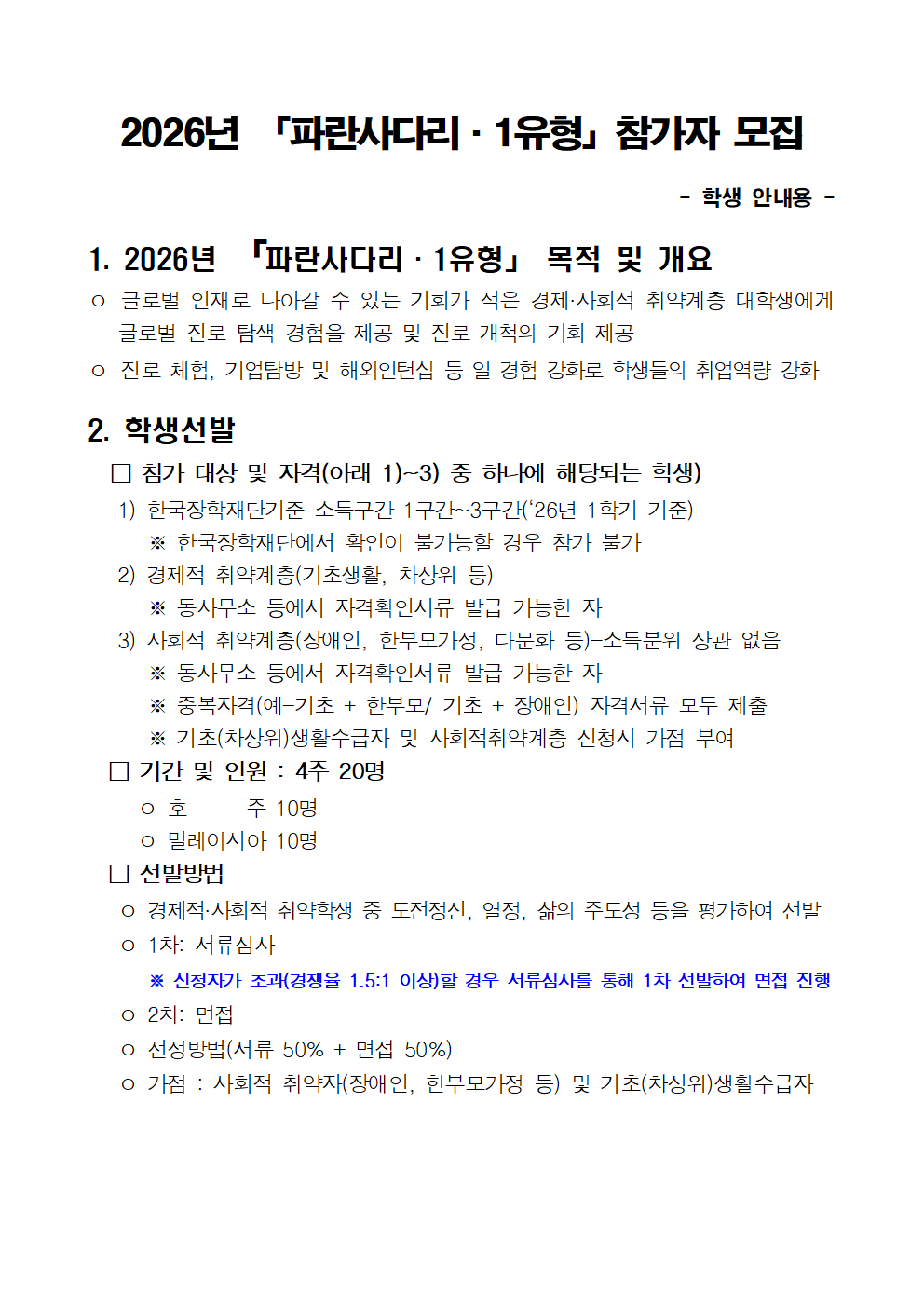 교육부 및 한국장학재단이 주관하는 2026학년도 파란사다리(1유형) 사업과 관련하여, 해외 연수 기회를 제공하고자 다음과 같이 참가자를 모집하오니 관심 있는 학생들의 많은 지원 바랍니다.