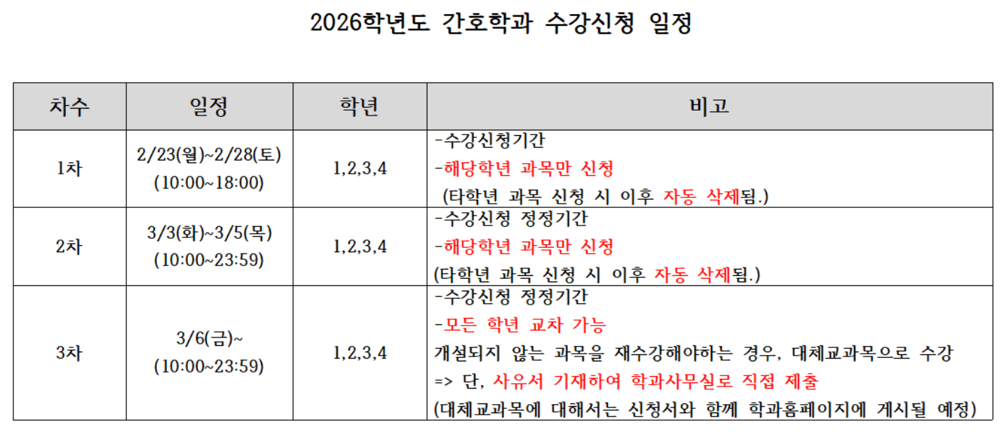 학교 전체 수강신청 기간과는 별도로, 우리 학과는 자체적으로 수강신청을 진행할 예정입니다. 내용을 확인하시어 수강신청 일정에 혼동이 없으시기 바랍니다.